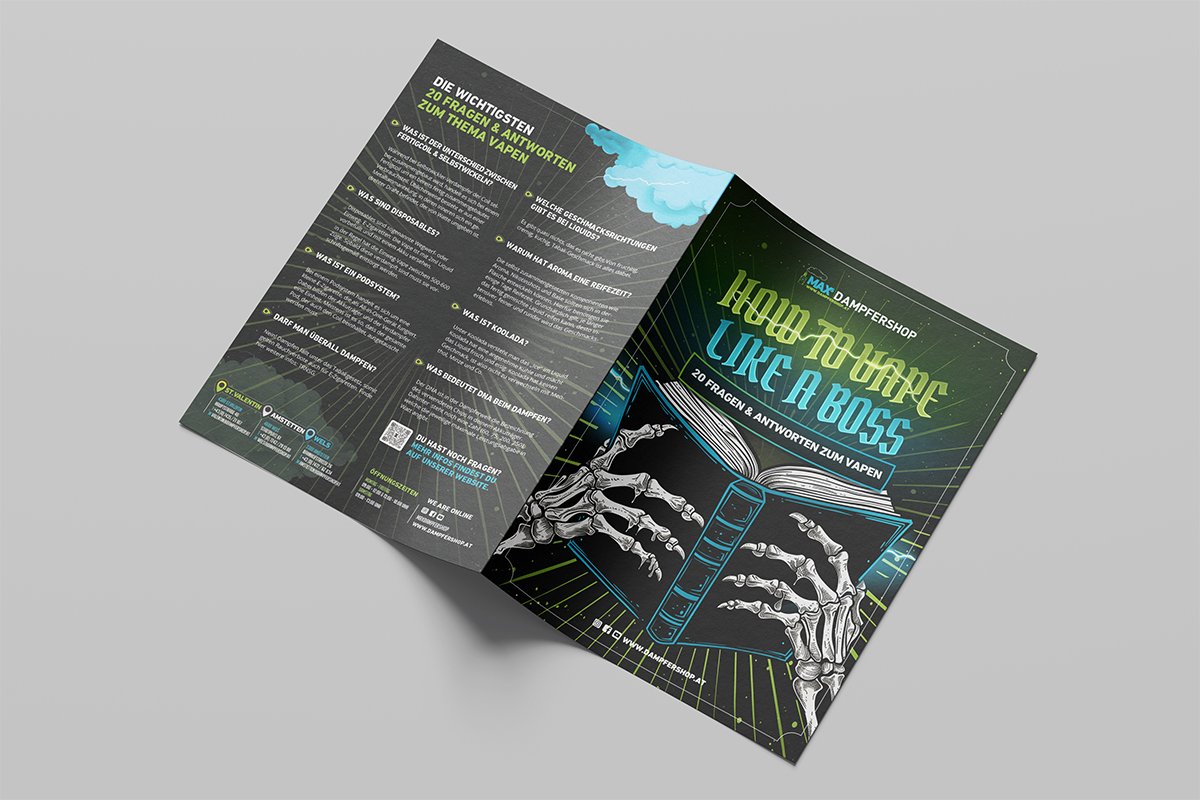 Für Maxs Dampfershop wurde ein gestalterisch aufwändiger Q&A-Folder zu den gängigsten Fragen rund um das Thema Vapen umgesetzt. Der 4-seitige Einbruch-Falz-Folder (geschlossen A5) bündelt viele Inhalte auf engem Raum und bleibt dennoch gut strukturiert und angenehm lesbar.